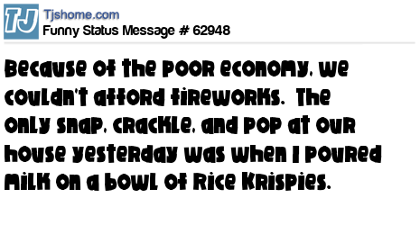 X is Because of the poor economy, we couldn't afford fireworks. The only snap, crackle, and pop at our house yesterday was when I poured milk on a bowl of Rice Krispies.