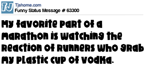- # 75359 My favorite part of a marathon is watching the reaction of runners when I hand them my plastic cup of vodka.