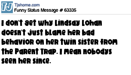 X says I don't get why Lindsay Lohan doesn't just blame her bad behavior on her twin sister from the Parent Trap. I mean nobodys seen her since.
