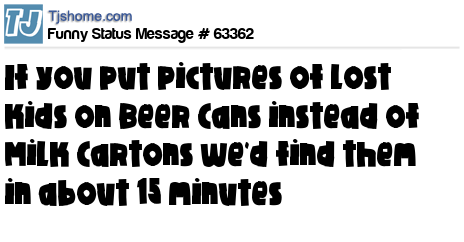 - # 65277 if they started putting missing childrens pis on beer cans instead of milk cartons, they'd be found within 15 mins..