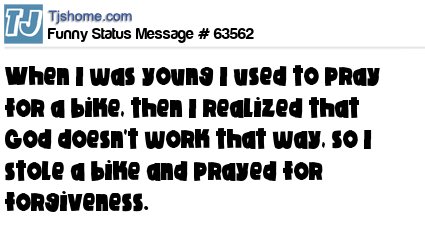 - # 21141 When I was young I used to pray for a bike, then I realized that God doesn't work that way, so I stole a bike and prayed for forgiveness