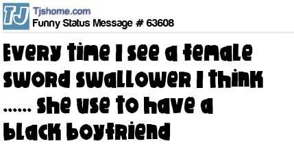 X  Every time I see a female sword swallower I think ...... she use to have a black boyfriend