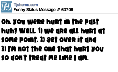 X  Oh, you were hurt in the past huh? Well, 1) we are all hurt at some point, 2) get over it and 3) I'm not the one that hurt you so don't treat me like I am.