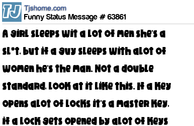 - # 50406 "Why is it that if a girl has sex with more than one guy she's a slut but if a guy has sex with more than one girl he's a legend?" The guy replies "If a lock can be opened by more than one key it's useless but if a key can open many locks its a master key