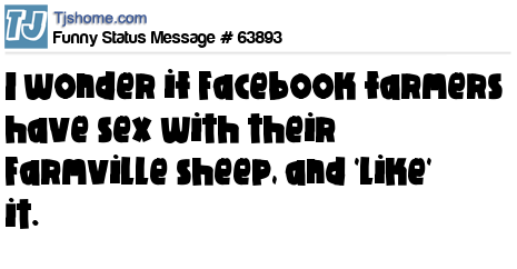 X I wonder if Facebook farmers have sex with their Farmville sheep, and 'like' it.