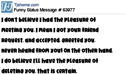 X I don't believe I had the pleasure of meeting you, I mean I got your friend request, and accepted, greeted you, never heard from you! On the other hand, I do believe I'll have the pleasure of deleting you, that is certain.