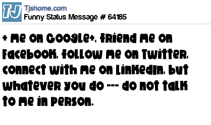 X + me on Google+, friend me on Facebook, follow me on Twitter, connect with me on LinkedIn, but whatever you do --- do not talk to me in person.