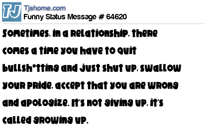 X says Sometimes, in a relationship, there comes a time you have to quit bullsh*tting and just shut up, swallow your pride, accept that you are wrong and apologize. It's not giving up, it's called growing up.