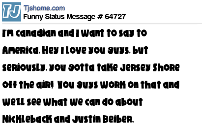 X I'm canadian and I want to say to America, Hey I love you guys, but seriously, you gotta take Jersey Shore off the air! You guys work on that and we'll see what we can do about Nickleback and Justin Beiber.