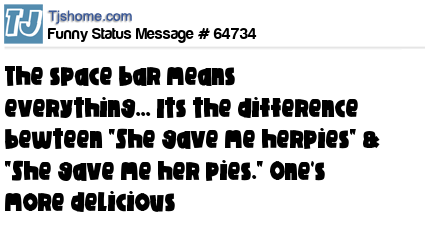 X The space bar means everything... Its the difference bewteen "She gave me herpies" & "She gave me her pies." One's more delicious