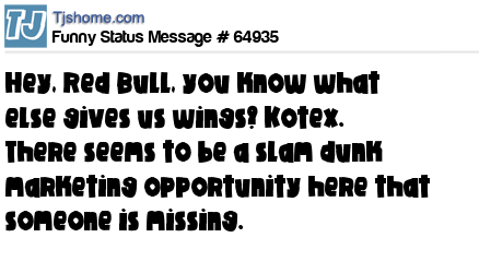 X is Hey, Red Bull, you know what else gives us wings? Kotex. There seems to be a slam dunk marketing opportunity here that someone is missing.