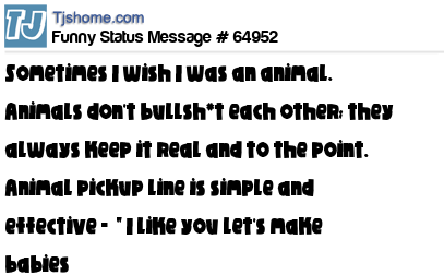X says Sometimes I wish I was an animal. Animals don't bullsh*t each other; they always keep it real and to the point. Animal pickup line is simple and effective - " I like you let's make babies”