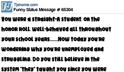 X  You were a straight-A student, on the honor roll, well-behaved all throughout your school years.......Now today you're wondering why you're unemployed and struggling. Do you still believe in the system "they" taught you since you were a child??