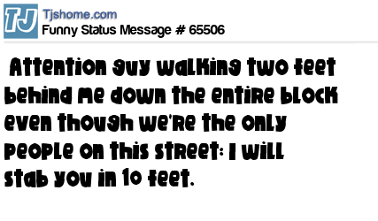 X Attention guy walking two feet behind me down the entire block even though we're the only people on this street: I will stab you in 10 feet.