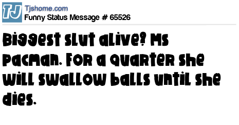- # 17672 who is the biggest prostitute alive? Mrs. pacman , because for 25 cents that bi*ch will swallow balls until she dies!
