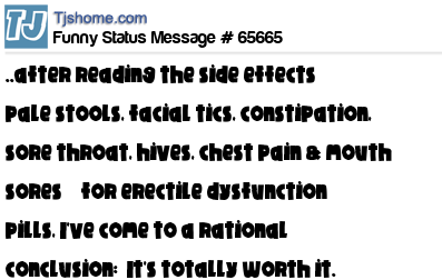 X says ..after reading the side effects – pale stools, facial tics, constipation, sore throat, hives, chest pain & mouth sores – for erectile dysfunction pills, I've come to a rational conclusion:  It's totally worth it.