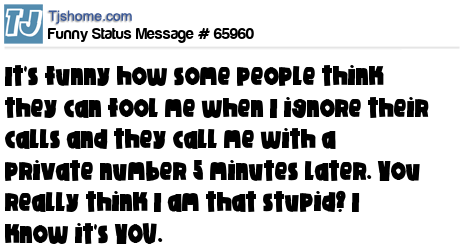 X says It's funny how some people think they can fool me when I ignore their calls and they call me with a private number 5 minutes later. You really think I am that stupid? I know it's YOU.