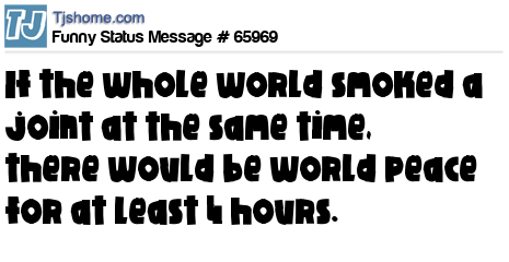 - # 65988 If the whole world smoked a joint at the same time, there would be world peace for at least 4 hours but a food shortage after..LOL