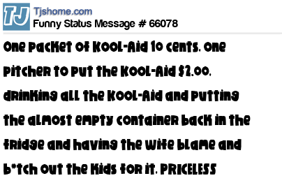 X says One packet of Kool-Aid 10 cents, one pitcher to put the Kool-Aid $2.00, drinking all the Kool-Aid and putting the almost empty container back in the fridge and having the wife blame and b*tch out the kids for it, PRICELESS