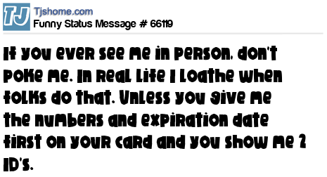 X is If you ever see me in person, don't poke me. In real life I loathe when folks do that. Unless you give me the numbers and expiration date first on your card and you show me 2 ID's.