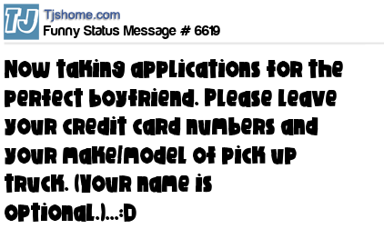 X is now taking applications for the perfect boyfriend. Please leave your credit card numbers and your make/model of pick up truck. (Your name is optional.)...:D