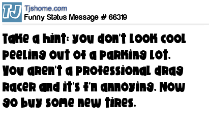 X says Take a hint: you don't look cool peeling out of a parking lot. You aren't a professional drag racer and it's f'n annoying. Now go buy some new tires.