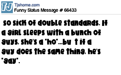 X is so sick of double standards. If a girl sleeps with a bunch of guys, she's a "ho"...but if a guy does the same thing, he's "gay".