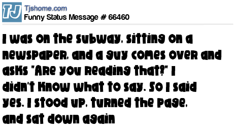 - # 50128 I was on the subway, sitting on a newspaper, and a guy comes over and asks ‘Are you reading that?” I didn't know what to say. So I said yes. I stood up, turned the page, and sat down again.