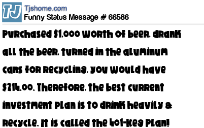 X is purchased $1,000 worth of beer, drank all the beer, turned in the aluminum cans for recycling, you would have $214.00. Therefore, the best current investment plan is to drink heavily & recycle. It is called the 401-Keg Plan!