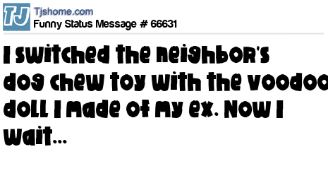 X I switched the neighbor's dog chew toy with the voodoo doll I made of my ex. Now I wait...