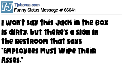 X I won't say this Jack in the Box is dirty, but there's a sign in the restroom that says "Employees Must Wipe Their Asses."