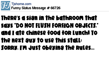 X says There's a sign in the bathroom that says "DO NOT FLUSH FOREIGN OBJECTS," and I ate chinese food for lunch! To the next guy to use this stall: Sorry, I'm just obeying the rules...