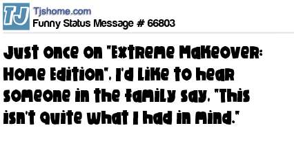- # 66933 Just once on "Extreme Makeover: Home Edition", I'd like to hear someone in the family say, "This isn't quite what I had in mind