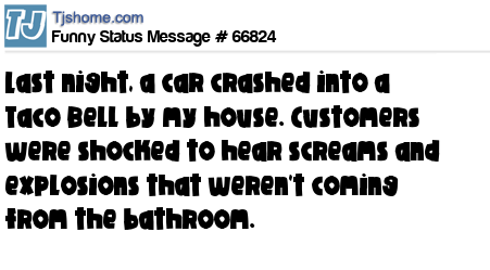 X  Last night, a car crashed into a Taco Bell by my house. Customers were shocked to hear screams and explosions that weren't coming from the bathroom.