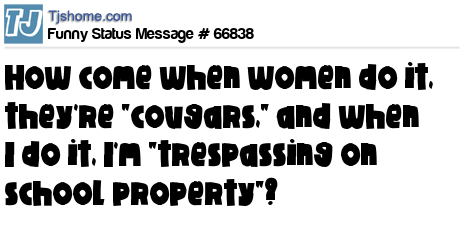 X is How come when women do it, they're "cougars," and when I do it, I'm "trespassing on school property"?