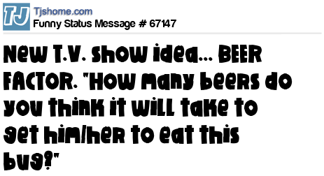 X New T.V. show idea... BEER FACTOR. "How many beers do you think it will take to get him/her to eat this bug?"