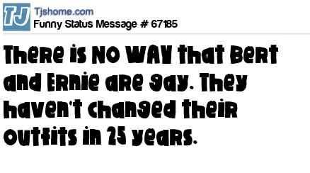 - # 67203 Sesame street announced this week that Bert and Ernie are not Gay. I knew that already, They have no sense of style and haven't changed their outfits in 25 years. They are just dirty old men like me.