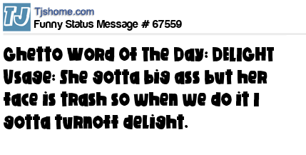 X says Ghetto Word Of The Day: DELIGHT Usage: She gotta big ass but her face is trash so when we do it I gotta turnoff delight.