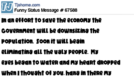 X In an effort to save the economy the Government will be downsizing the population. Soon it will begin eliminating all the ugly people. My eyes began to water and my heart dropped when I thought of you, hang in there my friend. Be strong.
