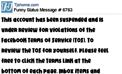 X This account has been suspended and is under review for violations of the Facebook Terms of Service (TOS). To review the TOS for yourself, please feel free to click the Terms link at the bottom of each page. Inbox items and well feed posts will be visible