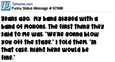 X Years ago, my band gigged with a band of morons. The first thing they said to me was, "We're gonna blow you off the stage." I told them, "In that case, right here would be fine."