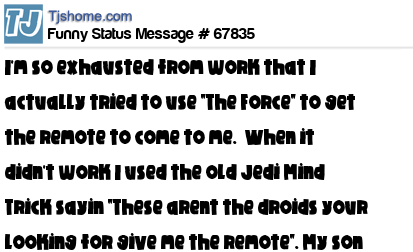 X I'm so exhausted from work that I actually tried to use "The Force" to get the remote to come to me. When it didn't work I used the old Jedi Mind Trick sayin "These arent the droids your looking for give me the remote". My son did while rollin his eyes.