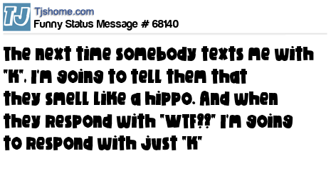 X is The next time somebody texts me with "k", I'm going to tell them that they smell like a hippo. And when they respond with "WTF??" I'm going to respond with just "k"