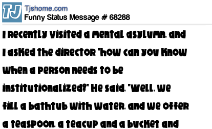 X is I recently visited a mental asylumn, and I asked the director "how can you know when a person needs to be institutionalized?" He said, "Well, we fill a bathtub with water, and we offer a teaspoon, a teacup and a bucket and ask them to empty the tub." I sa