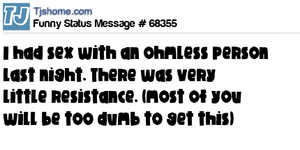 X I had sex with an ohmless person last night. There was very little resistance. (most of you will be too dumb to get this)