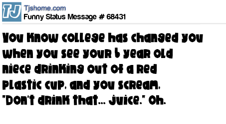 X is You know college has changed you when you see your 6 year old niece drinking out of a red plastic cup, and you scream, "Don't drink that... juice." Oh.
