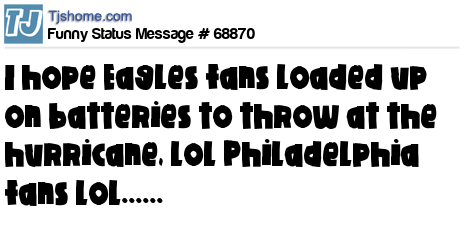 X I hope Eagles fans loaded up on batteries to throw at the hurricane, lol Philadelphia fans lol......
