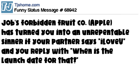 X says Job's forbidden fruit co. (Apple) has turned you into an unrepentable sinner if your partner says "iLoveU" and you reply with "When is the launch date for that?"
