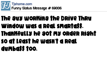 X The guy working the Drive Thru Window was a real smarta$$. Thankfully he got my order right so at least he wasn't a real dumba$$ too.