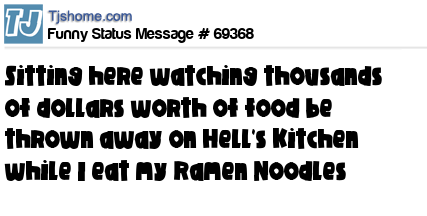 - # 66734 Sitting here watching thousands of dollars worth of food be thrown away on Hell's Kitchen while I eat my Ramen.